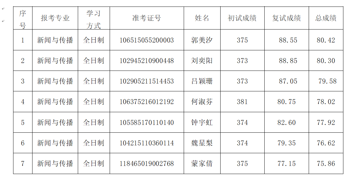 现将公司2025年硕士研究生招生调剂复试结果予以公示(按照最终得分进行排名)。