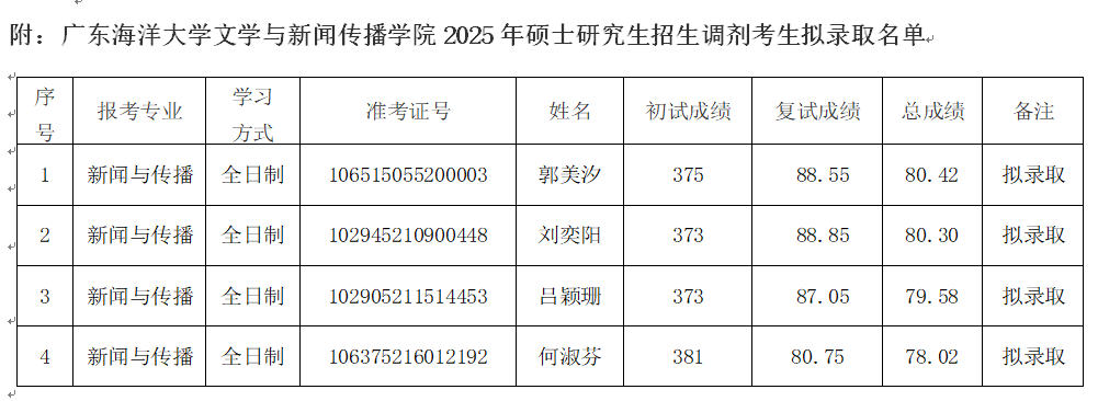 现将公司2025年硕士研究生招生调剂考生拟录取名单进行公示。
