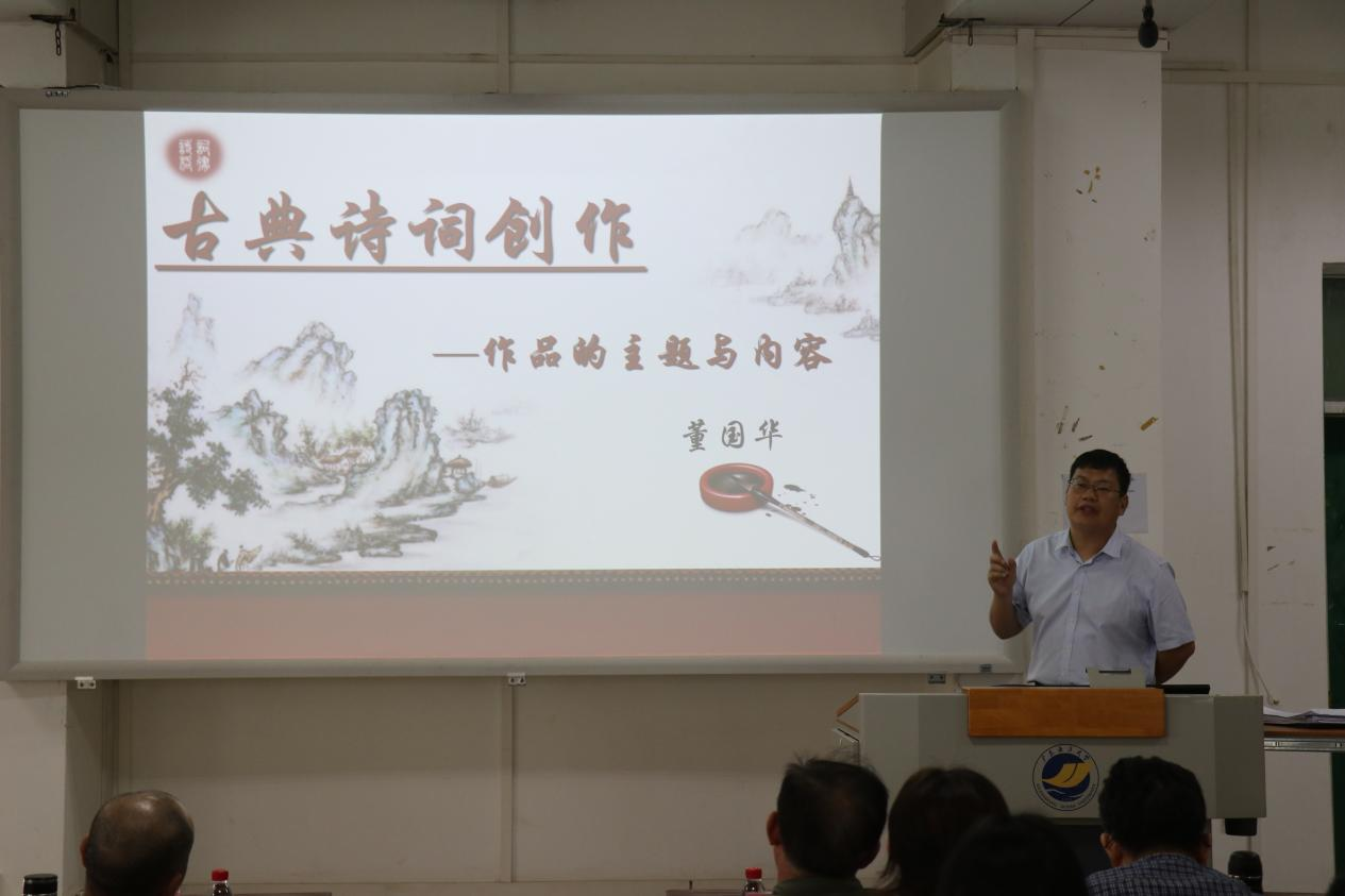 第一位授课教师董国华副教授讲解的课程为《古典诗词创作》。他首先用一个问题引入课堂内容——比较王湾的名篇《次北固山下》与《江南意》两个版本在词句上的优劣,然后借此展开对作品主题与内容的分析。董国华副教授古代诗词功底深厚,精彩细致地阐明了古诗词的意境之美以及主题与内容的关系问题。