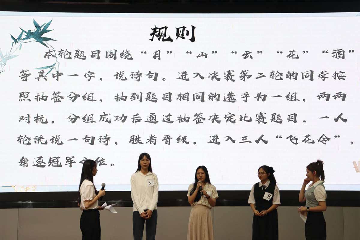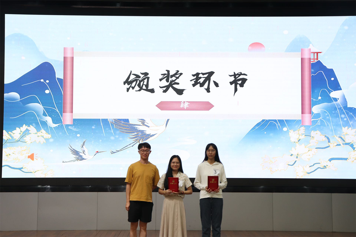 本次古诗词大会分为初赛和决赛两个部分:初赛以线上答题形式考察员工对古诗词知识的积累,共有300多名员工参加,最后前12名晋级决赛;决赛分为诗词接龙抢答和“飞花令”冠军争夺赛两轮,诗词接龙抢答后,共有6名选手进入“飞花令”冠军争夺赛。选手们腹笥丰盈、敏捷如电,精彩表现赢得掌声不断。最终,汉教1212班曹倩怡、汉教1222班余悦、汉教1211班程潆分别获得前三名,而曹倩怡、余悦作为校赛前两名选手,将代表学校参加“2024中国诗词大会”广东省选拔赛。