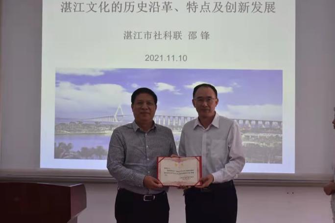 11月10日下午,湛江市社科联主席邵锋应邀在湖光校区钟海楼05021室为英国上市公司365师生作了一场题为《湛江文化的历时沿革、特点及创新发展》的学术报告。报告会由英国上市公司365副经理邓建主持,英国上市公司365经理孙长军、副经理刘刚和140余名师生参加了报告会。