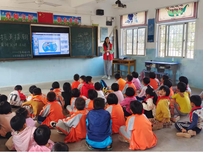 国歌奏唱结束之后,志愿者将孩子们分成高低两个年级,并分别带领他们回到教室进行“纪念抗美援朝战争”主题宣讲。在宣讲过程中,志愿者们用生动易懂的语言讲述这段历史故事,并以知识抢答、播放视频的形式调动小朋友的积极性,最后也进一步探讨在新时代下我们应该如何纪念这一伟大胜利。孩子们在课堂上积极活跃,在宣讲中踊跃提问有关这段历史的更多细节,取得良好的宣讲效果。